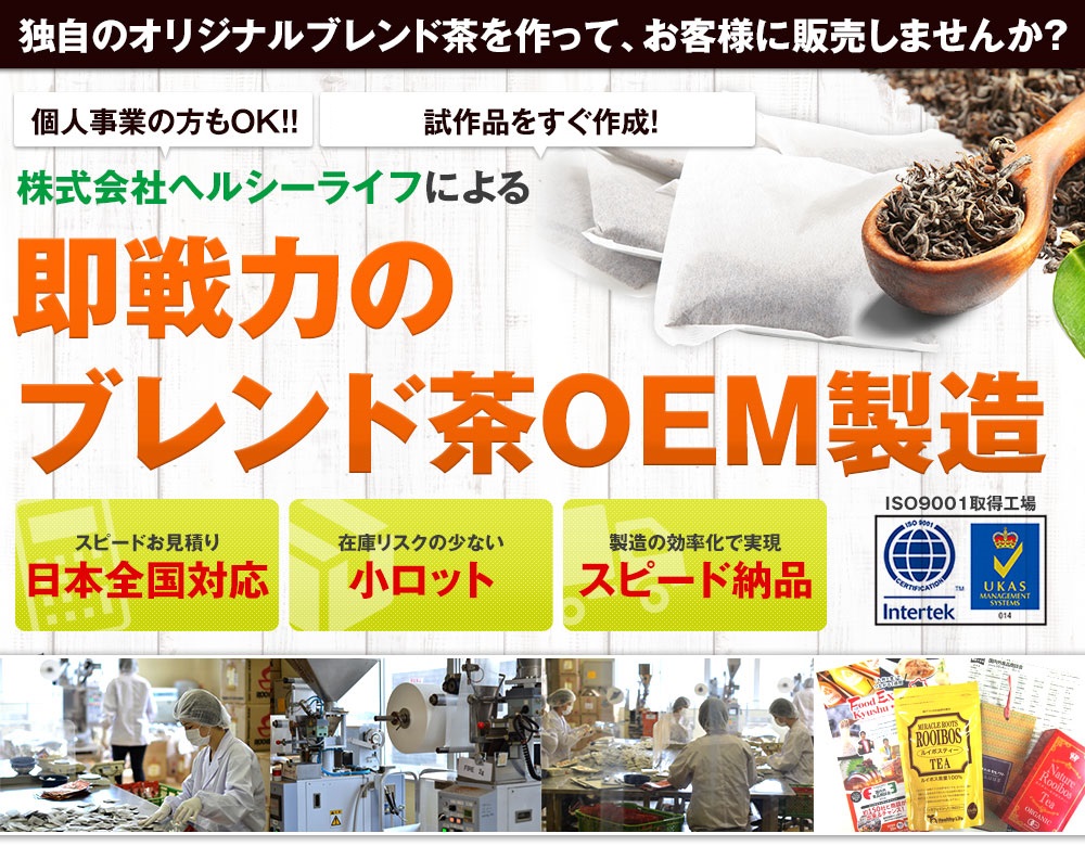 株式会社ヘルシーライフは、今、注目される健康茶ビジネスを「明朗手順・小ロット・スピード納品」で応援致します。